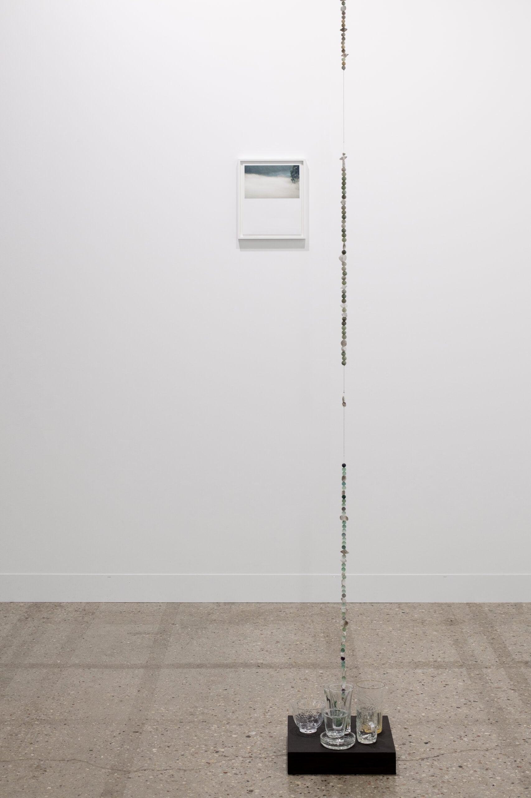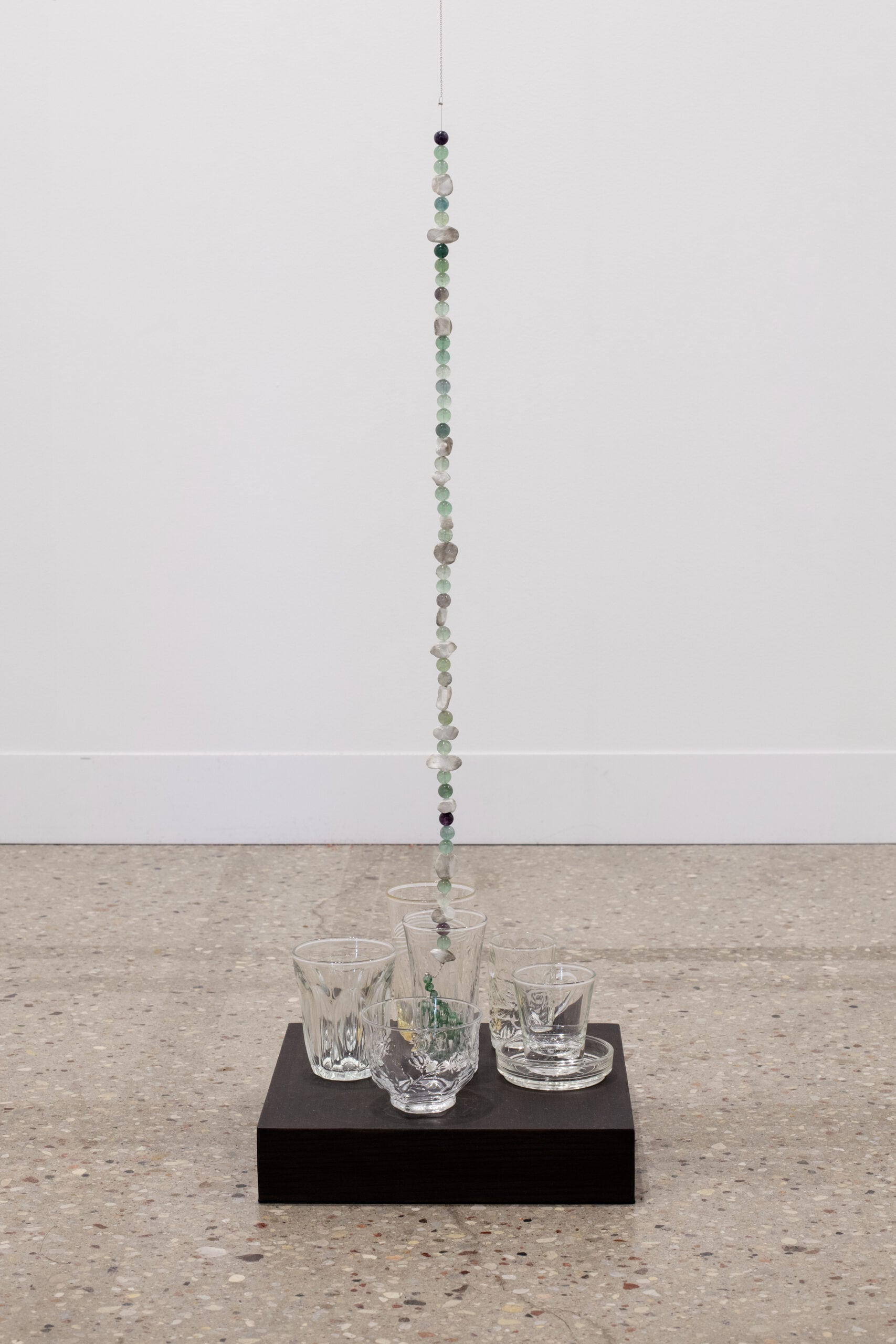 2024, chains, clay, jade, stone, found glasses on wood, dimensions variable
