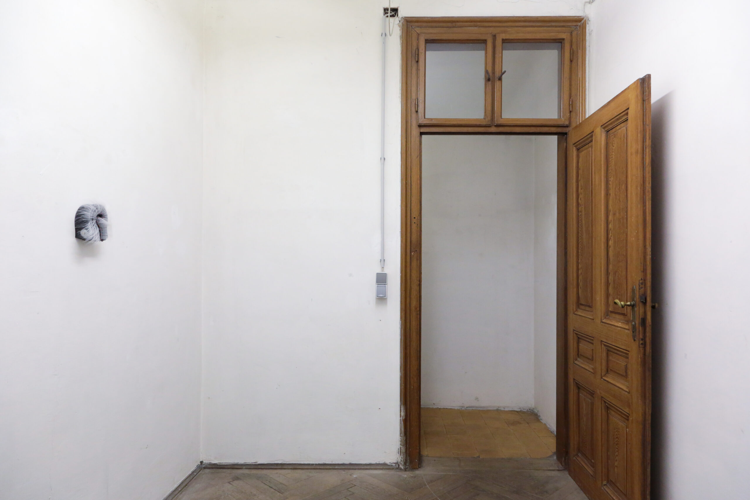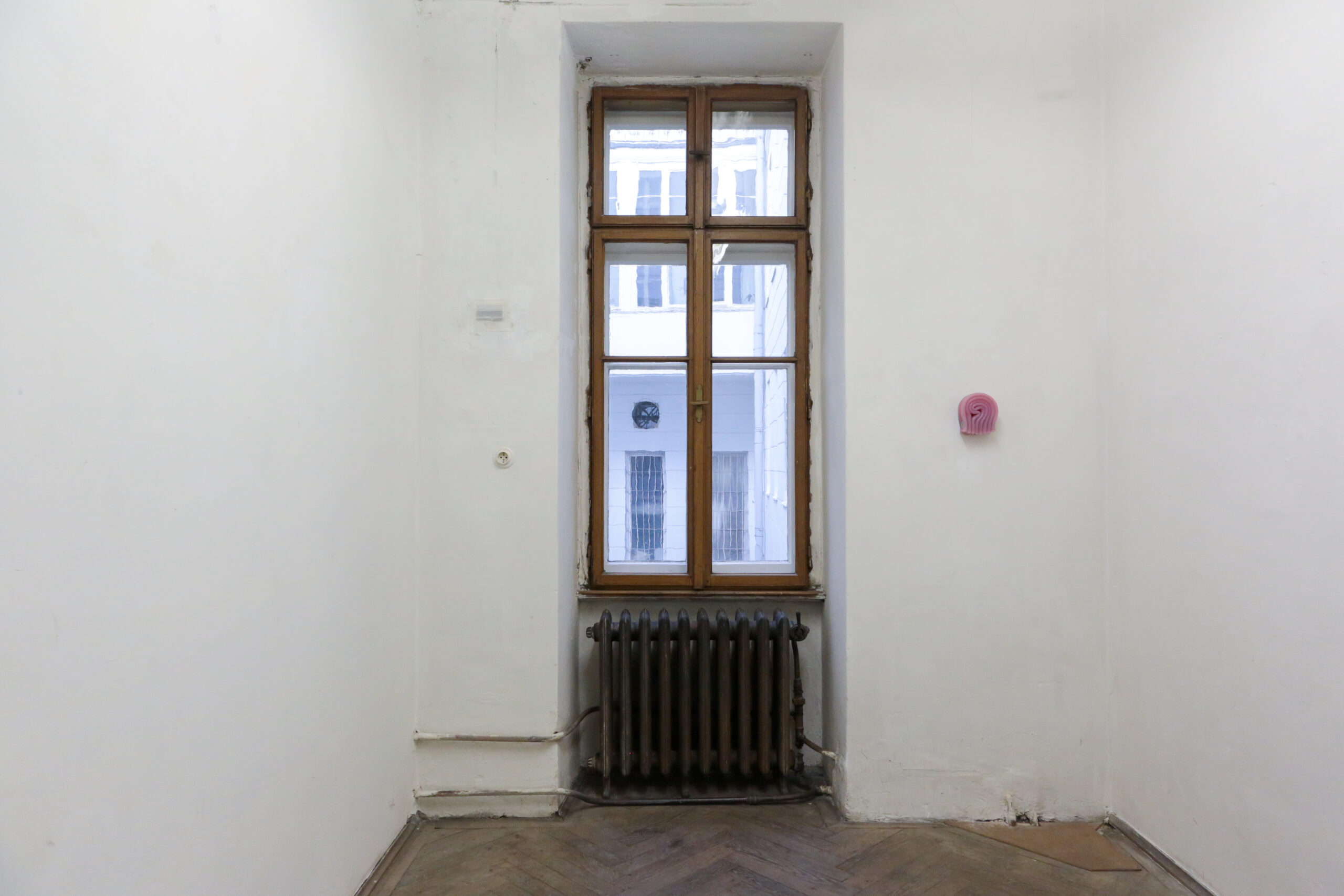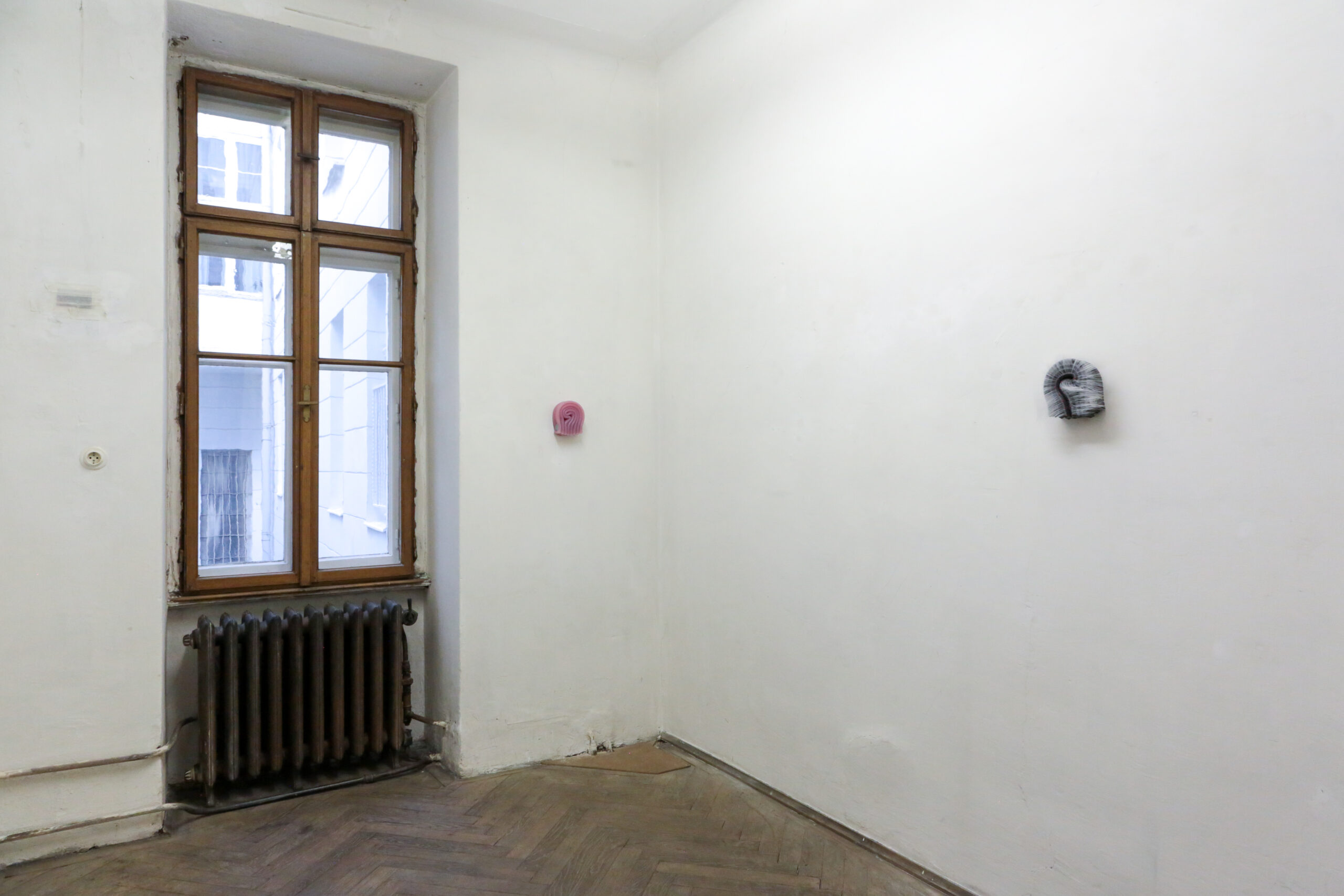 With our shared interest in getting to know the artworks in the exhibition, Laurenz (Vienna) and Shimmer (Rotterdam) begin our collaboration by curating Mike Kelley’s The Banana Man (1983) together with Marlie Mul’s Unnamed Charm (2024). The materiality of the artists’ respective works – silicone, plastic, synthetic hair, candles, potatoes, and a yellow sailor’s suit with many pockets – forms a counterpoint to the historic architecture of Laurenz and its natural patina. Both artists are known for creating personas in their work – think Extracurricular Activity Projective Reconstruction (2000-11) by Kelley, and You Look Great For Your Age (2021) by Mul, their works are visceral, humorous, and precise.