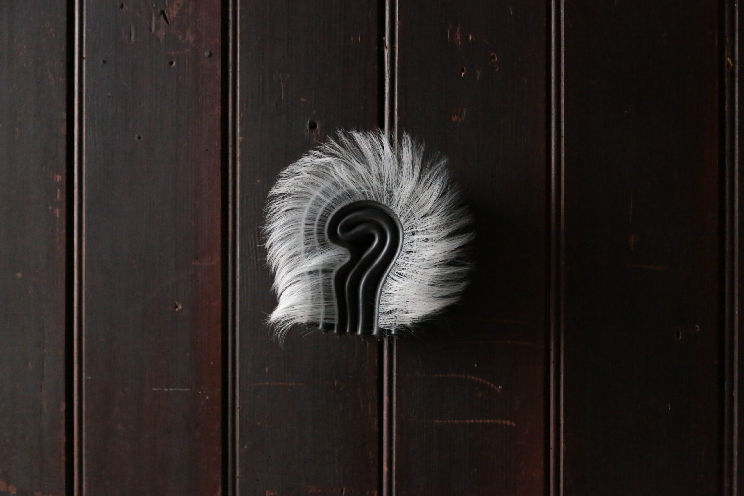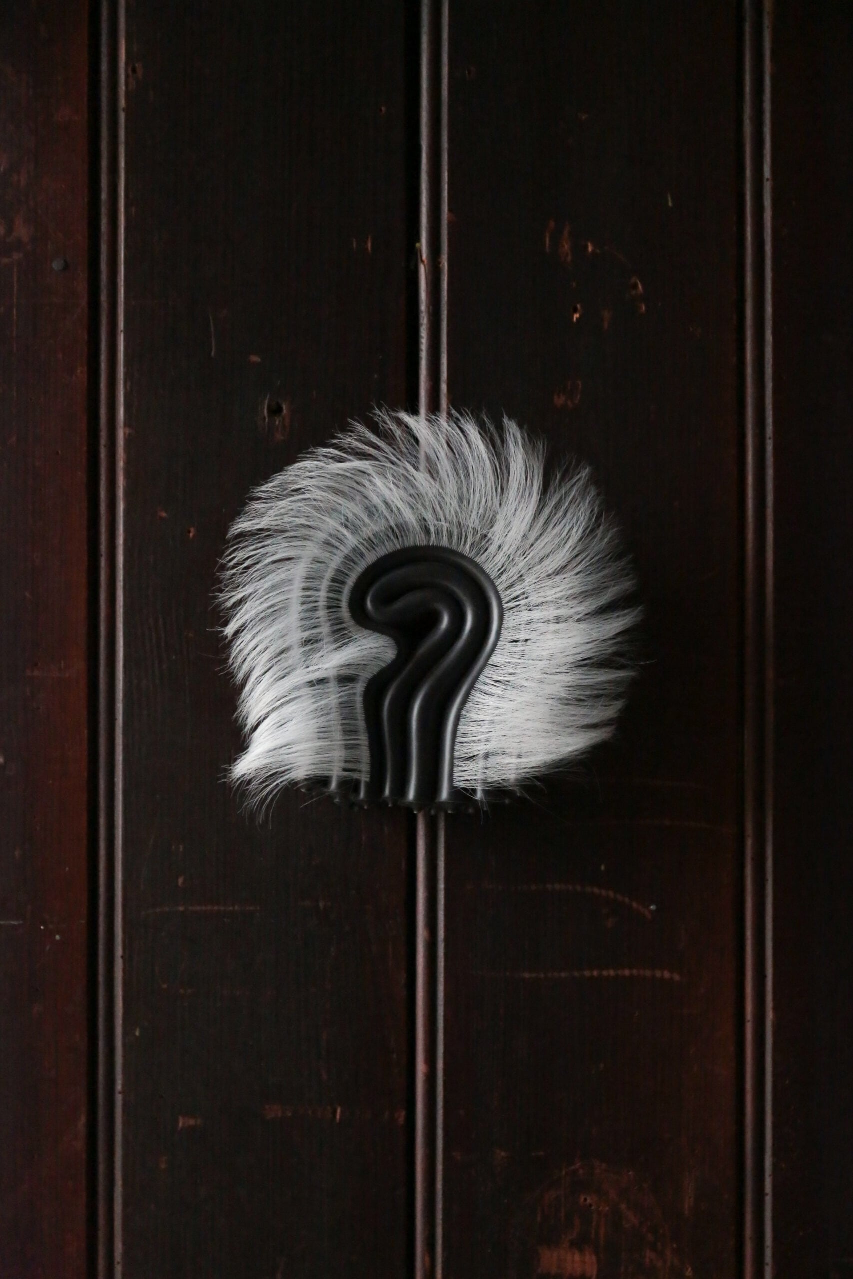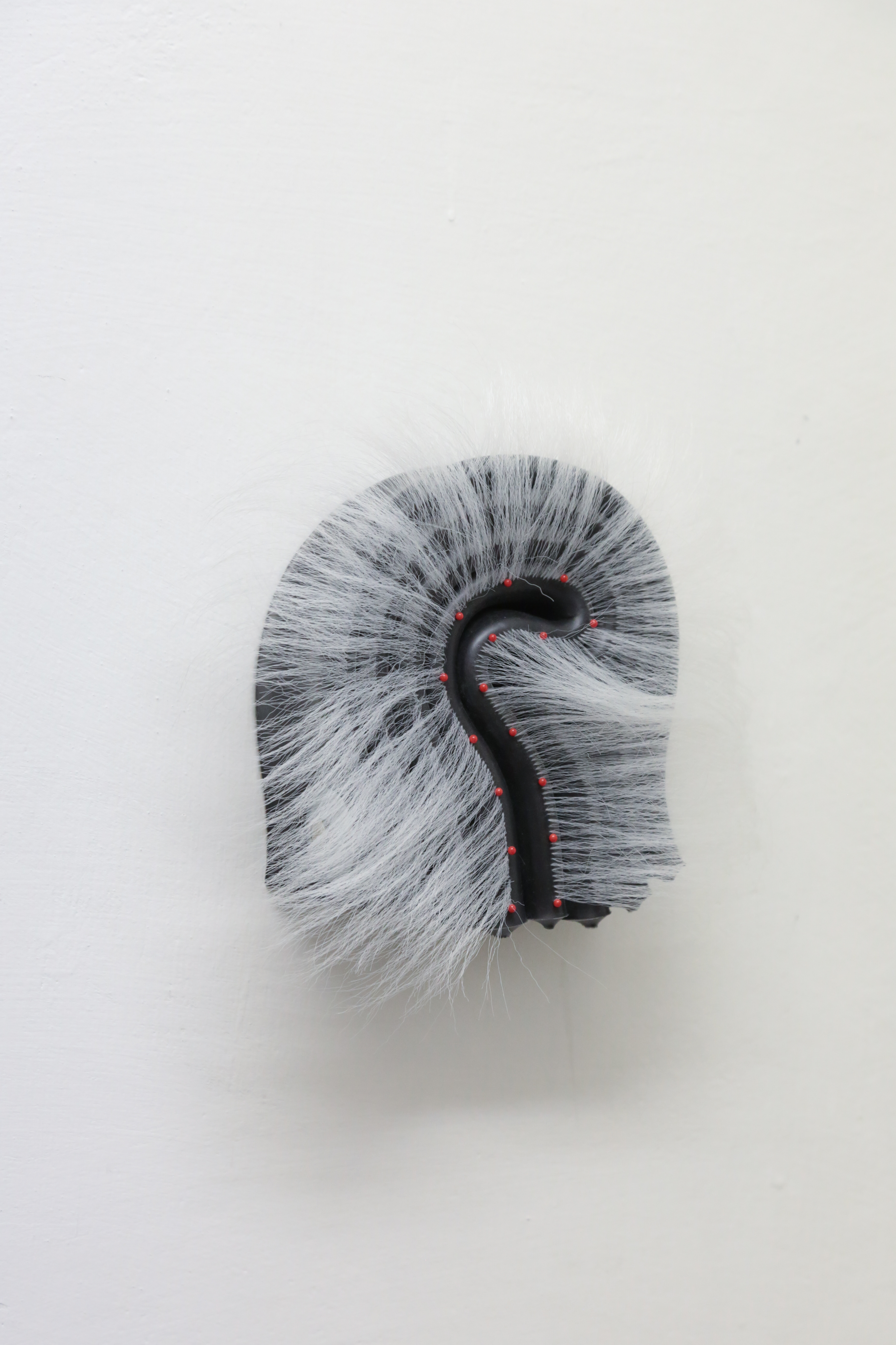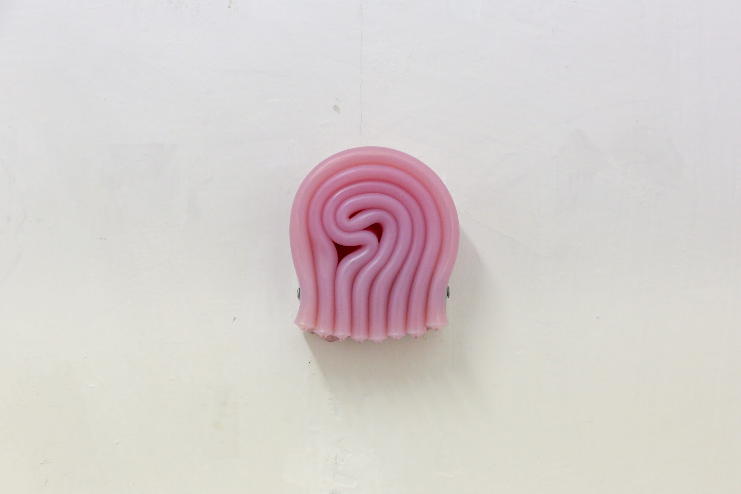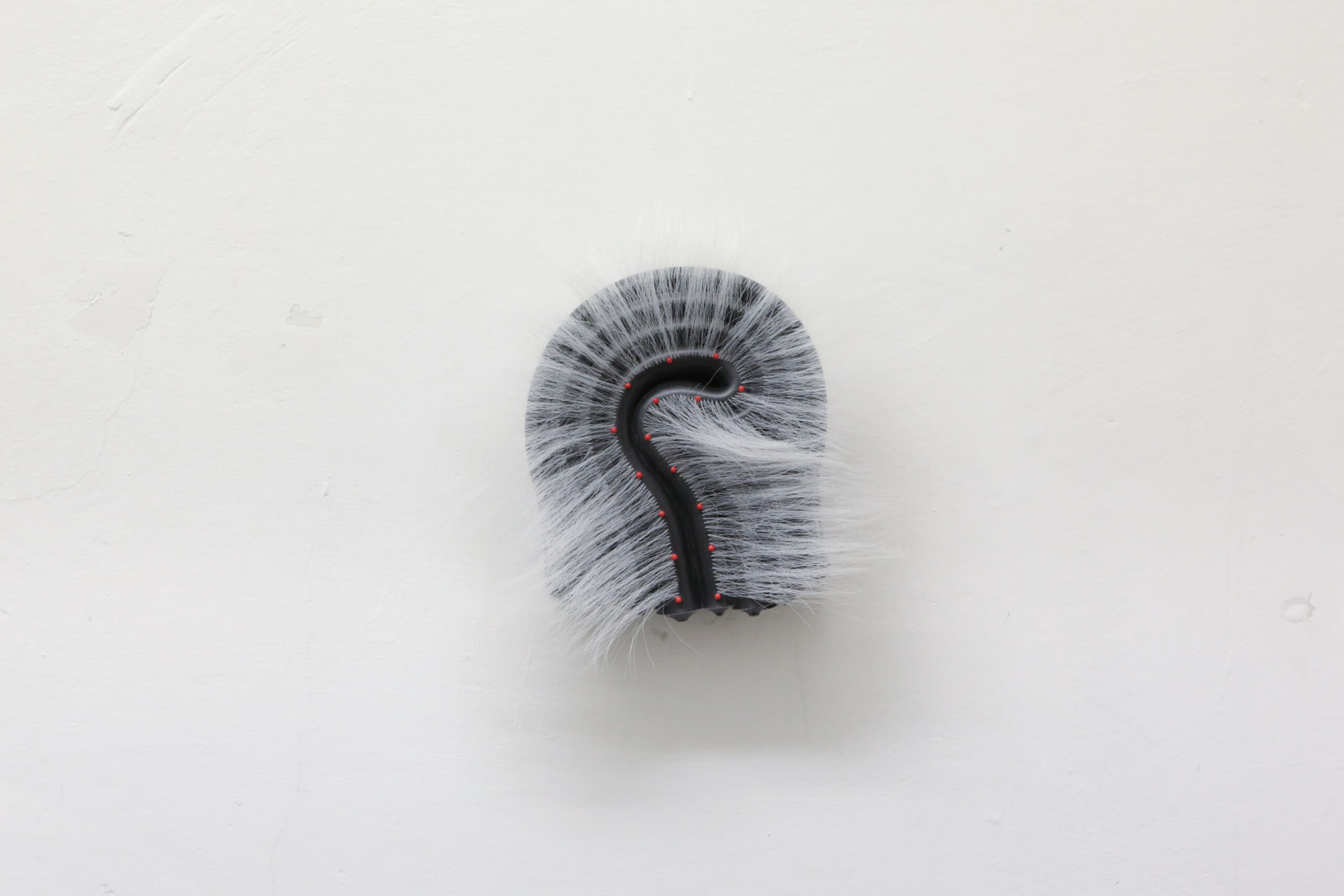 In the Unnamed Charm series, folded and curled colored silicone sheets, black, silver, yellow and reds—are held together with steel hardware, creating small bijou-like, tense objects that might fit in one’s hand. Installed throughout the room, each one has its own persona. Some are sprouting synthetic hair, adding a soft-edged aura to the hard edges of the boldly colored silicone. Others have small plastic bones protruding from their crevices, or red-tipped pins stuck into the material. The lines of the parallel folds form vague question marks.